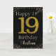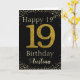 Happy Birthday with simulated golden glitter number 19 set on solid black and framed by faux diamonds and rhinestones. Happy birthday and recipients name in off-white font. Personalize with name or message.