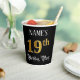 This luxurious and elegant birthday paper cup design features a personalised name and the message “19th Birthday Party”. The large number “19th” has an imitation/faux gold-inspired colouring pattern, the words “Birthday Party” are in fancy script-style text, and the background is coloured black by default (although it can be customised). Fancy, opulent paper cups like this might be useful at a birthday celebration being held in celebration of somebody’s nineteenth birthday. [~Z0000567]