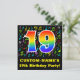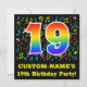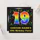 The front of this fun, exciting, and colourful birthday party invitation design features a large number "19" with a rainbow spectrum gradient inspired pattern, along with a personalised name and the message "19th Birthday Party!". Part of the background has a fun pattern of various music notes and symbols having a variety of colours and sizes. The back features editable information pertaining to the event that the potential guests are being invited to. Fun, customised birthday celebration invitation cards like this might be used when inviting guests to attend a celebratory gathering being held to honour a song composer’s, a musician’s, a singer’s, or somebody else’s nineteenth birthday. [~Z0000427]
