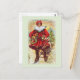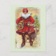 Vintage Santa Claus saying, "Happy Christmas." Saint Nick carrying his pack of treats and toys over a bridge with a sun rising behind him.