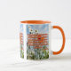 This two-tone mug showcases a design that features a Saira Condensed print font with green letters orange coloured outline featuring the "1 John 3:8" KJV bible scripture verse over this picture with an upclose view of a field of flowers with white petals green stems under a cloudy light blue sky in the background of this faith based theme. This verse is referencing the Book Of 1 John 3rd chapter showing the 8th verse in this bible scripture quote theme from the King James bible. The rim & handle are glazed in matching colours available in 11-ounce or 15-ounce sizes microwave and dishwasher safe ceramic construction.
