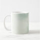 Inspirational quote coffee mug depicts a beautiful delicate wreath with blue and green leaves and features Bible Verse 1 John 4:19, "We love because He first loved us."-