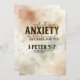 Christian flat greeting card with inspirational quote scripture depicts a modern neutral tone abstract watercolor background. It features an encouraging Bible Verse from 1 Peter 5:7, "Cast all your anxiety on him because he cares for you." The greeting, prayer can be personalised or deleted for a hand written message.