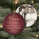 Cheers and Happy Anniversary! Celebrate any year wedding anniversary with a custom photo red and gold round ceramic ornament. Picture, number of years, couple's names, and marriage date on this template are all simple to personalize. Design features a burgundy faux brushed metallic background, vintage art deco style typography, elegant script calligraphy, and one photo of your choice. This stylish modern keepsake ornament adds an elegant touch to Christmas home decorations and makes a unique Xmas gift idea. Please note that gold is printed color, not metallic foil.