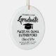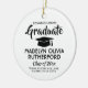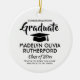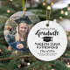 Commemorate the graduate's achievement with a custom photo black and white round graduation Christmas ornament. Picture and all text are simple to customise. Include school name and degree, congratulations, thanks mum and dad, or other message of your choice. Design features a white background, a black graduation cap, personalised modern typography name, school, & class year, and one photo of your choice, such as a senior picture or image from the commencement ceremony. Makes a thoughtful keepsake gift idea and an elegant addition to Xmas home decor. Congratulations to the graduate!