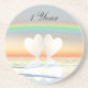 Coaster with my original design of two paper hearts, representing one year of marriage, floating on the water under a rainbow. Customisable text says "1 Year".