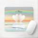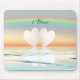 Mouse pad with my original digital artwork of two paper hearts floating on the water under a rainbow. Customisable text says "1 Year".