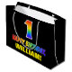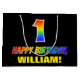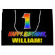 This fun, cheerful, and colourful birthday themed gift bag design features a large number "1" and the message "HAPPY BIRTHDAY,", both having a rainbow spectrum gradient inspired pattern colouring, along with a bold yellow custom recipient name. The background is coloured black. A fun birthday themed gift bag like this may be used to wrap a gift or present being given to somebody who is celebrating their 1st birthday. [~Z0000477]