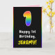 This bold and cheerful birthday-themed greeting card design features a large number “1“ with a multicolored rainbow spectrum inspired gradient pattern, along with the message “Happy 1st Birthday,”, and a personalised recipient name. The inside features an editable birthday greeting message, or could perhaps be cleared and left blank if a message is to be written by hand instead. An upbeat, personalised birthday greeting card like this might be a fun way to send birthday greetings to somebody who is celebrating their first birthday. [~Z0000627]