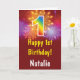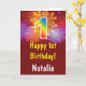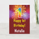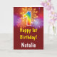 1st Birthday Colourful Rainbow Fireworks Red Card with personalised name. For further customisation, please click the "Customise it" button and use our design tool to modify this template.