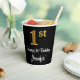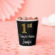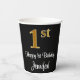 This sophisticated, elegant, and stylish birthday paper cup design features a large ordinal number “1st” having an imitation/faux gold-like look, plus the birthday greeting message “Happy 1st Birthday,” and an editable name in a script-style font. It also has a black-coloured background. Paper cups like this might be use at a birthday party for somebody who is celebrating their 1st birthday. [~Z0000538]