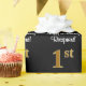 This luxurious, stylish, and elegant birthday-themed wrapping paper design features a large ordinal number “1st” having an imitation/faux gold-like appearance, plus the birthday greeting message “Happy 1st Birthday,” and an editable recipient name in a script-style font. It also has a black-coloured background. Wrapping paper like this might be used when wrapping gifts being given to somebody in celebration of their first birthday. [~Z0000515]