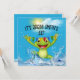 Green frog with birthday banner jumping out of blue water on sky background for a 1st birthday party.