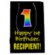 This exciting, fun, and colourful birthday themed gift bag design features a large number "1" with a rainbow spectrum gradient style pattern, along with the message "Happy 1st Birthday,", and a customisable recipient name. It has a black-coloured background. A fun gift bag like this might be used when wrapping presents being given to somebody in celebration of their 1st birthday. [~Z0000512]