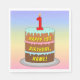 This cheerful and colourful birthday paper napkin design features a cartoon-style depiction of a three-tier birthday cake having a numeral-shaped candle on top showing the number “1“, along with the message “HAPPY 1ST BIRTHDAY,”, and a personalised recipient name. The background features a multi-colour pastel rainbow spectrum inspired gradient pattern. Paper napkins like these might be used when celebrating somebody’s 1st birthday. [~Z0000623]