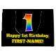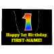 This colourful and vibrant birthday-themed giftbag design features a large number "1" having a rainbow spectrum gradient inspired pattern. It also features the message "Happy 1st Birthday,", and a customisable name. The background is coloured black. A fun gift bag like this might be used when wrapping presents being given to somebody in celebration of their first birthday. [~Z0000521]