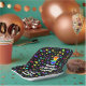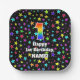 This fun and vibrant birthday themed paper plate design features a large number “1” with a rainbow spectrum gradient inspired pattern, along with the message “Happy 1st Birthday,”, and a personalised name. The background features a vibrant and colourful pattern having many star shapes with different sizes and colours. Birthday themed paper plates like this might be a fun way to celebrate somebody’s 1st birthday. [~Z0000582]