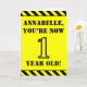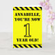 The front of this attention-grabbing and bold birthday-themed greeting card design features an editable name and the message "YOU’RE NOW 1 YEAR OLD!" in black stencil look text on a yellow coloured background. The front also features an eye-catching yellow and black striped pattern at the top and bottom edges. The inside features an editable birthday greeting message, or could perhaps be cleared and left blank if a message is to be written by hand instead. A customisable birthday card like this might be a fun way to acknowledge somebody’s first birthday. [~Z0000413]