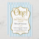 An elegant blue gold boys 1st birthday invitation, featuring pastel blue and white stripes with a faux gold glitter accent frame, cute black and gold text and a huge fancy "One!" at the top. A pretty blue birthday invitation for that sweet almost one year old boy.
