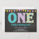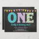 1st Birthday Invitation. Girl First Birthday Invitation.Turning one birthday party. Pink, Purple, Orange, Yellow, Green, Blue, Teal, Aqua. Stripes. Chalkboard Background. For further customisation, please click the "Customise it" button and use our design tool to modify this template.