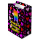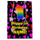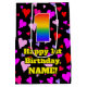 This colourful and fun birthday themed gift bag design features a large number “1” having a rainbow spectrum gradient inspired pattern. It also features the message “Happy 1st Birthday,”, and a custom name. The background features a pattern of heart shapes with colours like purple, red, and pink. A joyful birthday themed giftbag like this might be used when giving a gift or present in celebration of somebody’s first birthday. [~Z0000551]