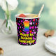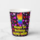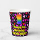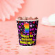 This happy and fun birthday themed paper cup design features a large number “1” having a rainbow spectrum gradient inspired pattern. It also features the message “Happy 1st Birthday,”, and a customisable name. The background features a pattern of pink, red, and purple heart shapes. Joyful, friendly paper cups like this might be fun to use at a birthday celebration/party being held in celebration of somebody’s 1st birthday. [~Z0000548]