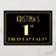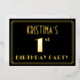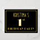 The front of this vintage-appearance first birthday party foil invitation features a personalised name, a large art deco look inspired number “1st”, the message “BIRTHDAY PARTY”, and a border pattern consisting of lines. The background of the front is coloured black by default, but it can be customised to a different colour if desired. The back features personalised details about the event, such as the date, time, venue, and any other important information. Elegant, luxurious, editable invitations like these might be used to invite guests to a birthday party being held in celebration of somebody’s 1st birthday. [~Z0000591]