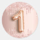 A blush, rose gold background decorated with faux glitter drips. Number 1 written with a balloon style font.