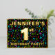 The front of this joyful and upbeat first birthday party/celebration foil invitation card design features an editable name, a large number “1st”, the message “BIRTHDAY PARTY!”, and a border. The background of the front features a fun, colourful musical symbols and notes pattern. The back features personalised details about the event, such as the date, time, location/venue, and any other important information. Personalised invitations like these might be a fun way to invite attendees to a birthday party/gathering being held to honour somebody’s 1st birthday. [~Z0000601]