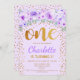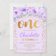Elegant design in purple, faux glitter gold with greenery and floral accent. Invite card with glitter "One" in script font with confetti. Perfect for a stylish 1st bday celebration.