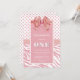 A pink and white 1st birthday invitation featuring a festive bow, polka dots, and zebra stripes while the text is framed with a faux glitter border.