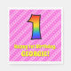 This cheerful and festive 1st birthday-themed paper napkin design features a large number "1" having a colourful pattern inspired by the look of a rainbow spectrum. It also features the message "Happy 1st Birthday,", and an editable name. The background features a light pink and dark pink stripes pattern containing loving pink heart shapes. Fun, personalised birthday themed paper napkins like this might be used at somebody’s 1st birthday party. [~Z0000417]