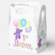 1st birthday party custom name gable favour box featuring a cuddly and cute purple teddy bear princess dressed up in a lovely yellow jewelled crown and pink, blue and green flower accessories holding a bunch of balloons with the word PARTY on them. Personalising with child's name makes it extra special. It's a fun royal theme for a special princess. Original design by Anura Design Studio.