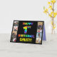 The front of this eye-catching and cheerful birthday themed greeting card design features the message “HAPPY 1ST BIRTHDAY,“ with a multicolored rainbow spectrum inspired gradient pattern, along with a customisable recipient name. To the left and the right of the rainbow-patterned message on the front are some photos that can be personalised, perhaps with photos of the recipient, the recipient’s family and friends, and/or the sender(s) of the card. The inside has a customisable birthday greeting message, or could perhaps be cleared and left blank if a message is to be written by hand instead. An upbeat, personalised birthday greeting card like this might be used to acknowledge somebody’s first birthday. (Photography © Storytree Studios, Stanford, CA.) [~Z0000667]