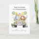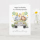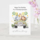 This watercolour 1st birthday card is suitable for a boy or girl. The design includes birthday stars, green and yellow birthday balloons, and a safari car with an elephant, giraffe and lion inside. All text is fully customisable.
