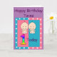 Birthday card for your special little twins first birthday. On the front is a big multi coloured number 1. Below the one is two little twin babies in a white nappies and a big smiles. This cute picture is in an pink and blue frame with white stars all the way round. Over the top are the words "Happy Birthday Twins in dark lettering. Inside are the words, "Wishing our special little twins a very happy birthday" All is in a template that you can delete or change to your own text.