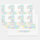 1st birthday wrapping paper designed with lots of birthday related words arranged into the shape of a 1 in a friendly colorful theme aimed for kids