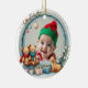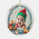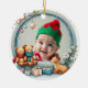 Celebrate your little one’s first Christmas with a keepsake that’s as heartwarming as it is adorable. This double-sided ornament is a festive burst of joy, featuring a customizable photo framed by a playful holiday scene: two cuddly teddy bears in cozy scarves, a cheerful reindeer with a shiny red nose, twinkling ornaments, and gift boxes wrapped with love. Delicate white flowers and lush greenery add a touch of elegance to the bottom edge, while a starry arch glows above like a winter night sky.