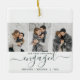 Commemorate your engagement with this beautiful modern keepsake ornament. The dark green text reads "Our first Christmas engaged," with the word "engaged" in elegant handwriting script with flourishes before and after. Replace the three sample images with your favourite vertical photos, and add your names and the year in dark green text on a white background.