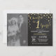1st Wedding Anniversary with custom photo. Chalkboard Black and Gold Invitation. Chalkboard Black and Gold Glitter Diamond Background. Gold Confetti. Adult Birthday. Woman or Man Male Birthday Party. For further customisation, please click the "Customise it" button and use our design tool to modify this template.