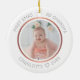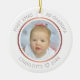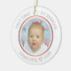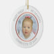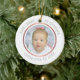 This personalised Christmas ornament features a modern faux rose gold design. Personalise the name, year and photos. It is double sided with a different photo on each side. This template works best with landscape format photos with the baby in the centre.