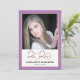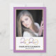This modern graduation party invitation features a square photo on the front and a full vertical photo on the back. The colour theme is purple and gold with the graduating year of 2020 appearing in an elegant script.