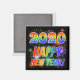 The front of this magnet design features the year number "2020" and the message "HAPPY NEW YEAR!" having a colourful rainbow spectrum inspired gradient pattern. The front also features a celebratory bursting fireworks inspired pattern. This might be a fun gift to give somebody in celebration of New Year's Day 2020.