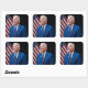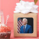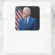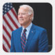 The photograph captures a moment in 2021 of President Joe Biden, image is now one of his official US Presidential photo. Sunlight streams through a window, casting a warm glow on the figure of an Biden standing confidently in the centre of the frame. His arms are crossed, a gesture that suggests both authority and a hint of casual ease. --- Mr. Biden is dressed impeccably in a blue suit, the crisp fabric contrasting sharply with the clean lines of his white shirt. A blue and red striped tie adds a touch of personality to the ensemble. --- A glimpse of patriotism is evident in the background. An American flag stands proudly on a pole to the man's left, its vibrant colours a bold contrast to the solid black behind Joe. A closer look reveals a painting hanging on the wall, adding a touch of personal flair to the professional atmosphere. --- President Biden is the focal point of the image. His short white hair frames a kind face, etched with the lines of a life well-lived. A warm smile plays on his lips, conveying a sense of confidence, wisdom, and perhaps a hint of amusement.