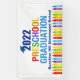 This adorable 2022 preschool graduation banner features a cool grad cap above colourful writing and a row of crayons in rainbow. Cute preschooler graduate sign in fun colours for the last day of elementary school with your kid's name personalised in white. Congratulations to our PreK graduates!