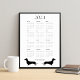 This elegant, yet simple dachshund calendar for 2024, features the full 12 month period. The design includes a modern set of fonts, along with 2 black dachshund dog silhouettes against a white baclground. Personalise this template with your own name or that of someone special, Great gift for someone who is fond of dachshund or wiener dogs. This template also comes in a 8.5 x 11 inch size which makes it easy download and print at home.