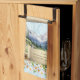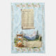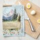 Blue damask kitchen towel/calendar towel.  Proverbs 16:9 “In their hearts humans plan their course, but the LORD establishes their steps." Hourglass with Alpine scene, pine trees, daisies, bird and scripture scroll.