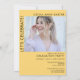 Modern Minimalist Two Photo Graduation Announcement & Grad Party Invitation with black text on white background. Back side is a marigold yellow with black text