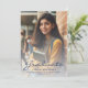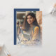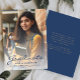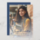 Modern graduation announcement featuring a custom vertical photo. The word "Graduate" appears in navy blue script, with the graduate's name, school and year of graduation below in sans serif font. Easily replace the sample image with your own graduate's photo. A white gradient screen helps ensure the text pops. Add details about your graduate's accomplishments and future plans on the reverse in gold-coloured text on a solid navy blue background. Ideal for high school or college graduation.