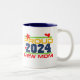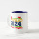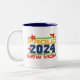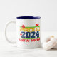 Proud New Mum 2024 mug with colourful text and hearts design.